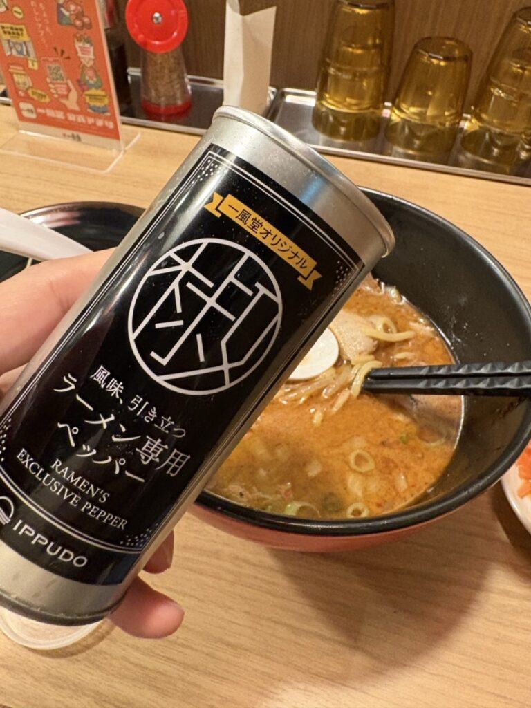 半分ほど食べ進めたところで、テーブルの脇に置いてあった一風堂オリジナルペッパーくんを投入したり、辛もやしや紅しょうがを加えて味変を楽しむ。