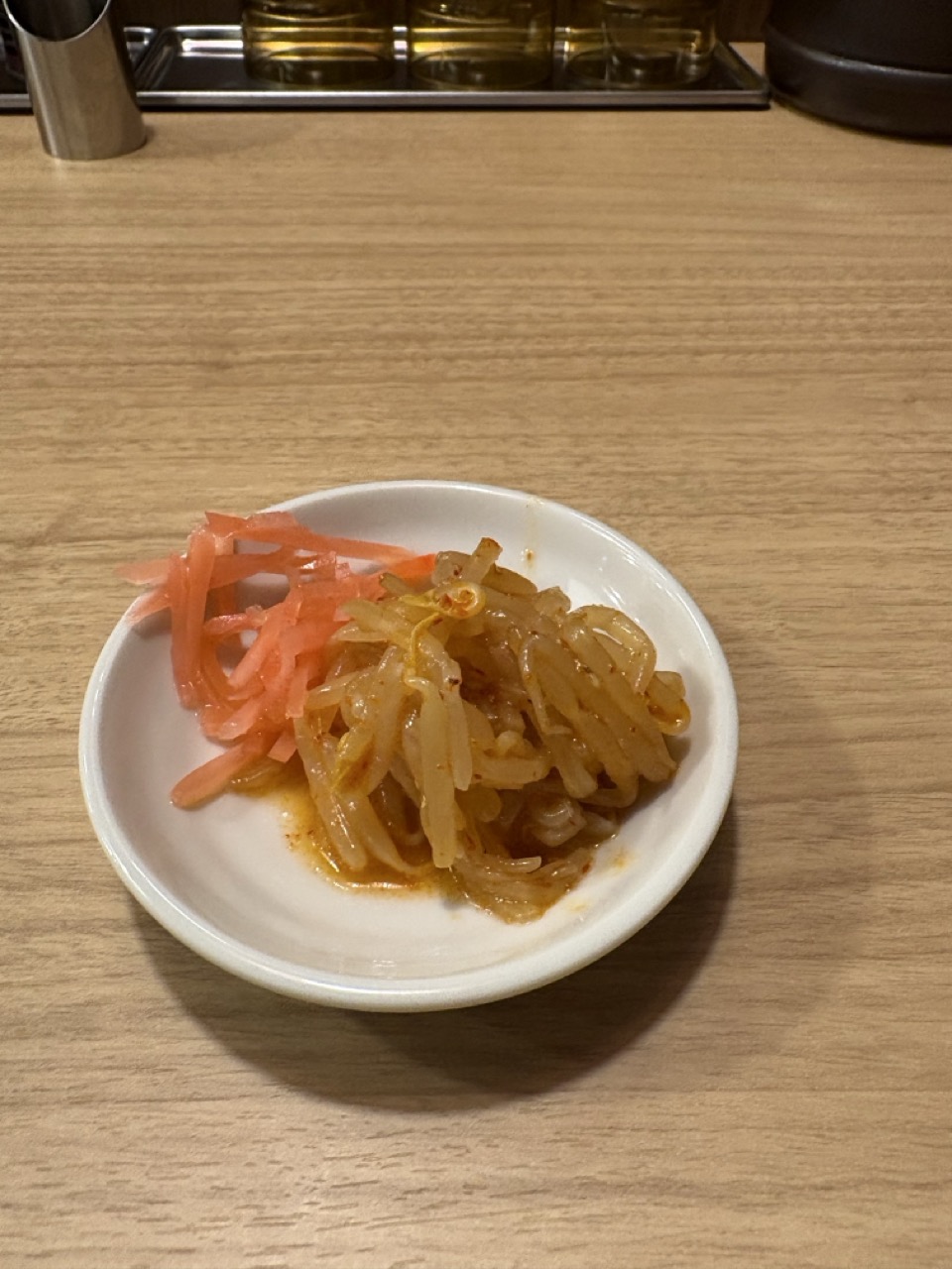 辛もやしを食べながら品が来るのを待つ。
