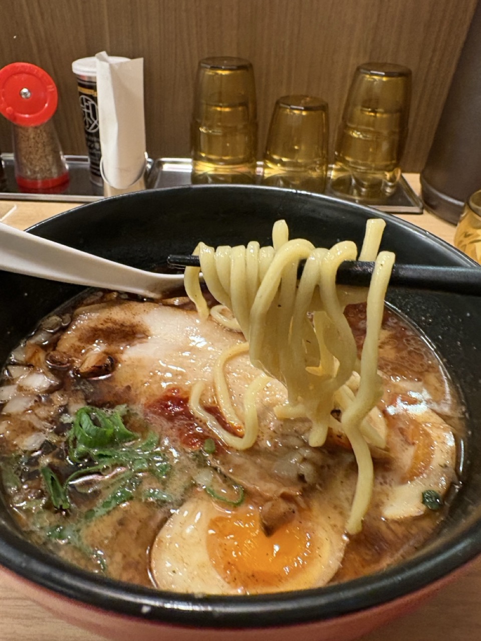細麺も悪くないけど、中太麺の方が濃厚なスープによく絡むのでこの一体感には勝てない。