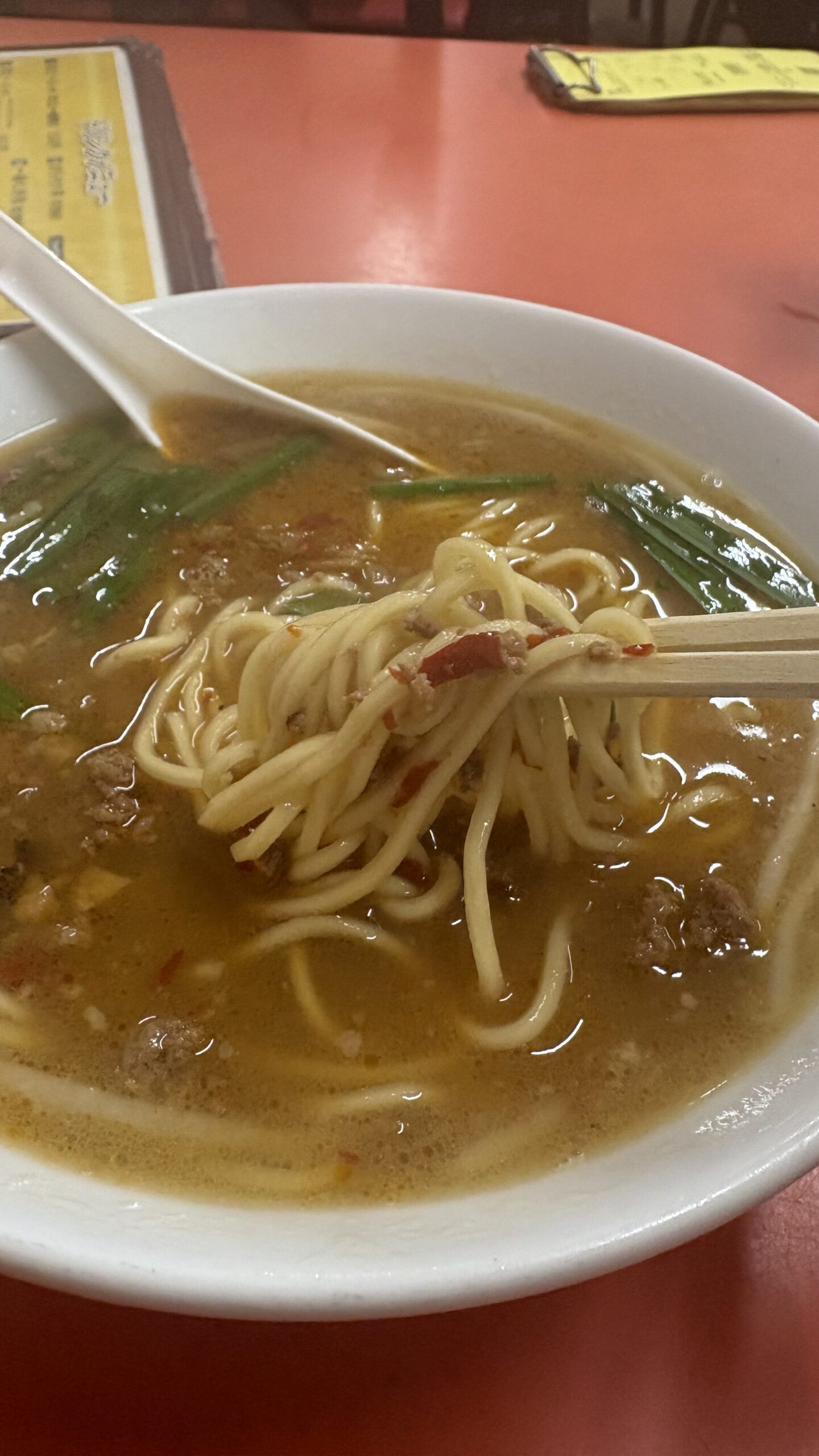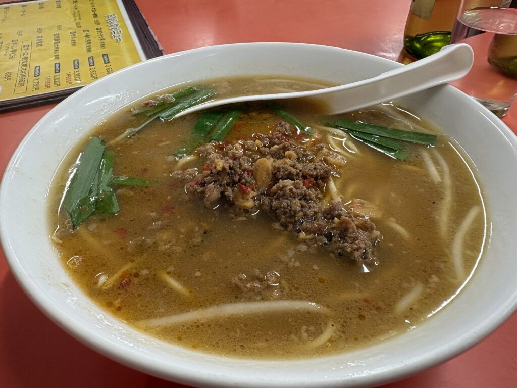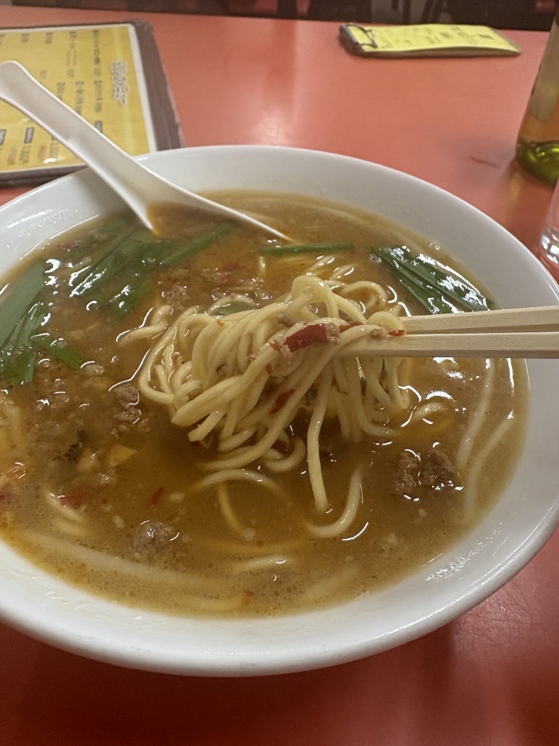 ひき肉の旨みとニラの香りが強く、細めの麺に辛いスープがよく絡む。